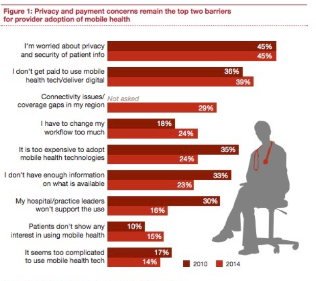 2010 ve 2014 yıllarındaki veriler karşılaştırıp baktığımızda ise; 2010 yılında doktorların %12′si mobil cihazlar üzerinden tıbbi kayıtlara erişebildiklerini söylerken, günümüz doktorlarında bu oran %45′e kadar yükselmiştir. Bunun yanında 2010 yılında doktorların %14′ü mobil cihazlarla beraber reçete yazabiliyorken, 2014 yılında bu hizmetten faydalanan doktorların oranı %41 olarak belirlenmiştir. Hastalarıyla mobil cihazlar üzerinden iletişim kuran doktorların oranında ise, 2010 yılından bu yana %10′luk bir artış gözlenmiştir.