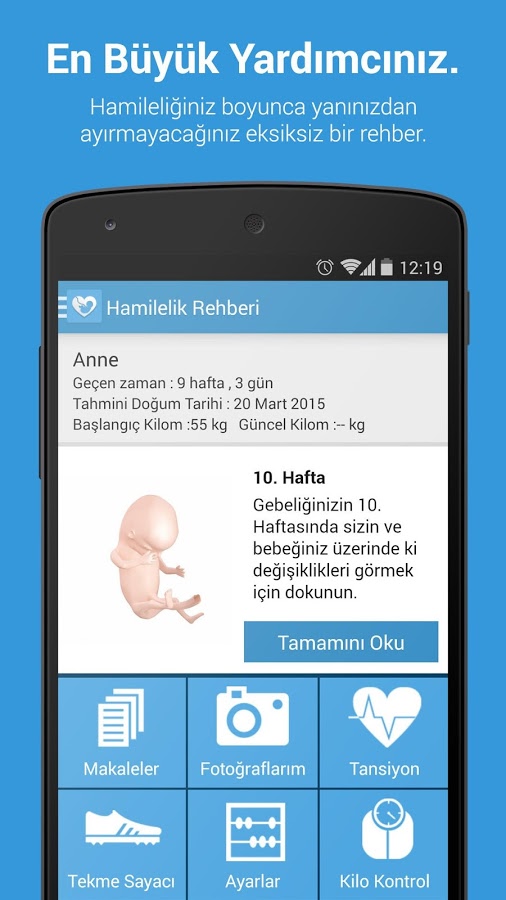 Hamileliğiniz boyunca sizi yalnız bırakmayacak uygulamanın içerisinde; hafta hafta gebelik takibi ve her hafta hamilelik durumunuzun fotoğrafını çekip galeride saklamanız için bir fotoğraf uygulaması bulunmaktadır. Kilo kontrol sayfası sayesinde ise her hafta kilonuzu güncelleyerek ne kadar artış gösterdiğinizi uygulamasa sayesinde rahatça gözlemleyebilirsiniz. Eğlenceli tekme sayacı sayfası ile bebeğinizin 40 hafta boyunca attığı tekmeleri günlük olarak kaydedebileceğiniz uygulama  Android uyumlu olup, aynı zamanda da ücretsizdir.